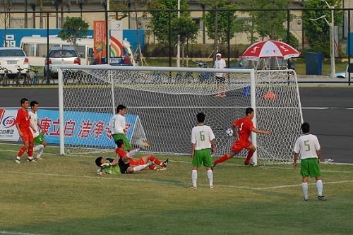 北理工队前锋18号杨思源和后卫3号卢斌双箭齐发,抢点门前,并由卢斌将对方守门员脱手之球补射网内。