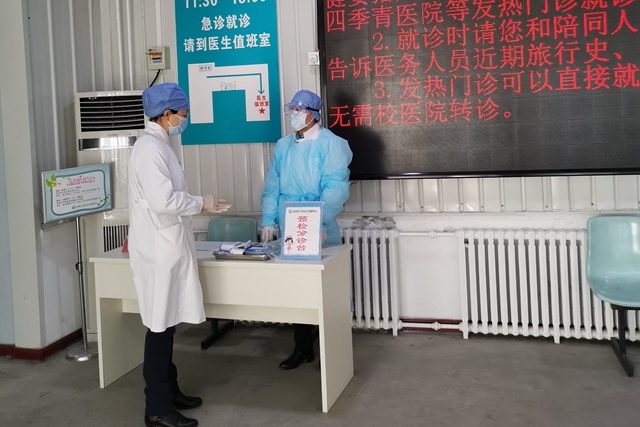 校医院作为校内的专业医疗机构,疫情之下,面临巨大的防控压力,而预检分诊正是校医院的第一道防线,把好这道关,才能保障校医院的环境安全,保障每一位来院就医人员的就医安全。时值春节假期临近,校医院医疗保障人员紧缺,作为校医院护理部主任,董淑华主动请缨:“我是护理部负责人,我来!”她第一时间承接下春节假期期间的预检分诊台值班任务。