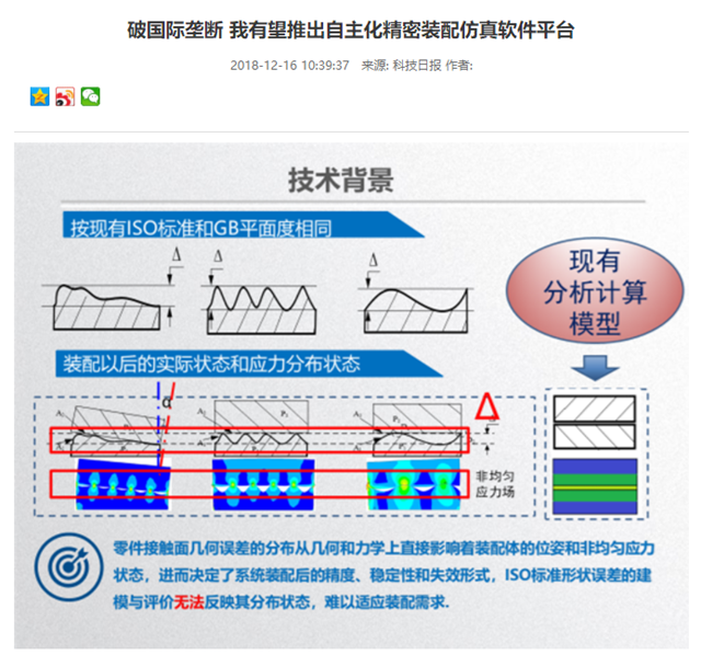 张之敬介绍,此前国内外采用的三维建模和仿真计算方法,由于缺乏对相关机理的突破,均未考虑零部件加工误差、表面质量、装配误差及装配工艺参数等因素对系统装配精度的影响,都是通过传统商用的三维设计软件平台采用理想尺寸加偏差尺寸所构成的模型进行仿真,这导致装配性能仿真及工艺优化参数误差和不确定性过大,无法定量指导装配工艺过程。而综合材料等方面的差距,更成为了制约我国若干关键领域仪表精度及稳定性提升的重要瓶颈。