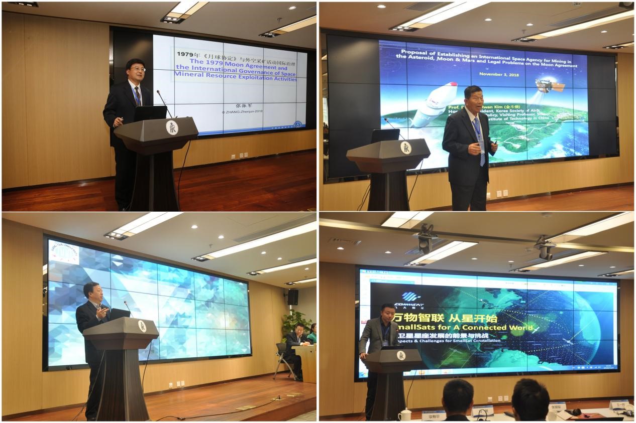 加拿大麦吉尔大学航空与空间法研究所教授、MILAMOS手册主编Prof. Ram Jakhu,中国航天系统科学与工程研究院院长薛惠锋,澳大利亚西悉尼大学法学院院长Prof. Steven Freeland,中国航天科技国际交流中心副主任、中国空间法学会秘书长张振军作了题为“全球空间治理面临的挑战”“开启星际命运共同体的伟大征途,走好法治外空大系统的人间正道”“未来的法律规范:国际空间法将如何应对小卫星星座?”和“1979年《月球协定》与外空采矿活动国际治理”的主旨报告。分别对全球空间治理的起源及其面临的挑战、构建“星际命运共同体”及中国的应对、小卫星星座建设中的空间法问题及国家责任问题、外空采矿相关法律规范问题进行了全面探讨。主旨报告内容精彩、观点精辟,受到广泛好评。