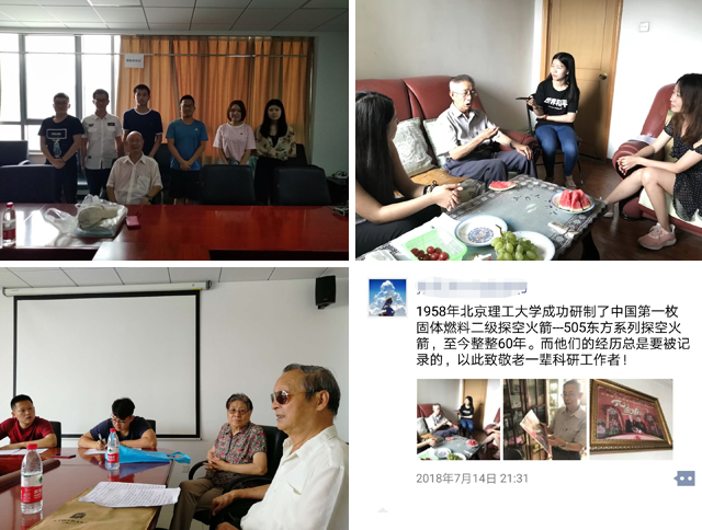 2018年,正值我校独立研制的中国第一枚固体燃料二级探空火箭——“东方”系列探空火箭发射成功60周年,为深入挖掘校史,传承红色基因,弘扬军工文化,在党委宣传部、离退休工作处/离退休教职工党委和学校出版社的支持下,宇航学院党委组织学院学生党支部开展了本次主题党日活动,活动采取登门拜访,并有针对性的开展口述史料采集。在本次活动中,共有1个本科生党支部和9研究生党支部参与其中,共拜访了17位参与“505”探空火箭研制的离退休教师。