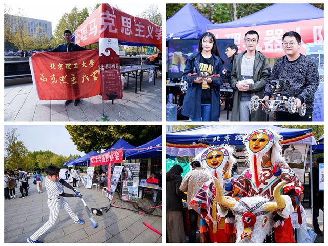 舞台下的社团都使出了十八般武艺,为校园生活描绘浓墨重彩的一笔。在马克思主义学会,信念越学越坚定,在京工演讲团,事理越辩越明晰;京工书画社前笔墨翻飞,一幅幅飒爽的书法作品散发着纸墨笔香;藏戏社、阿里郎韩语社的同学们穿着特色的民族服饰,用民族语言为前来咨询的同学写下名字和祝福; 在前沿科技论坛、机器人队、博冠天文社等科技实践类社团,同学们一睹大学生课外科技创新的成果作品;在绿萌资源与环境保护协会、护航者协会等志愿公益类社团,同学们感悟“奉献、友爱、互助、进步”的志愿者精神;鲲鹏棒垒球社、猎鹰橄榄球社、网球社等体育社团摆出各类体育用品,让同学们在互动与游戏中体验运动的快乐。